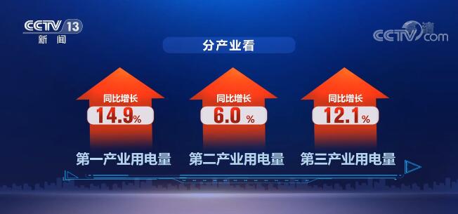 9月,全社会用电量达到6947亿千瓦时,同比增长6.8%,两年平均增长7.4%。分产业看,第一、二、三产业用电量分别同比增长14.9%、6.0%、12.1%;城乡居民生活用电量同比增长3.7%。
