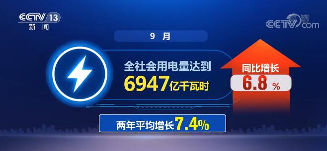 央视网消息:国家能源局今天(10月13日)发布的最新数据显示,9月份,我国经济持续稳定恢复,全社会用电量持续增长,同比增长了6.8%。