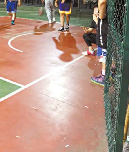 篮球场的吸烟者和地上的烟头。
