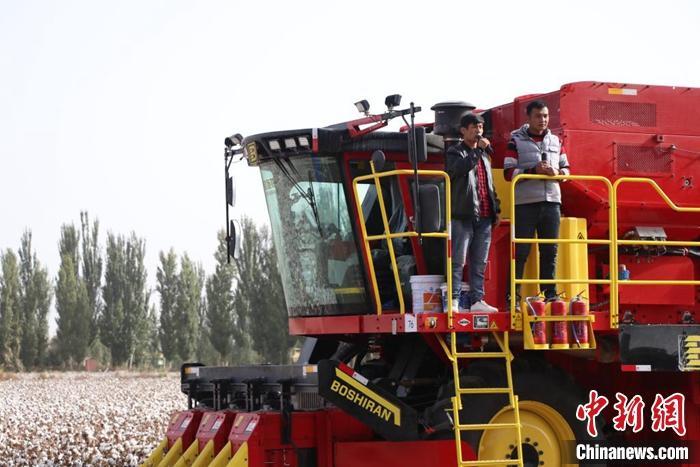 图为新闻发布会上,尉犁县采棉机司机塞米·玉素甫(左一)展示了他驾驶的采棉机。 中新社发 苟继鹏 摄