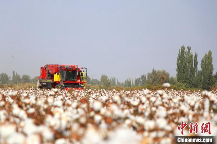 图为新疆尉犁县一台采棉机正在棉田采摘棉花。中新社发 苟继鹏 摄