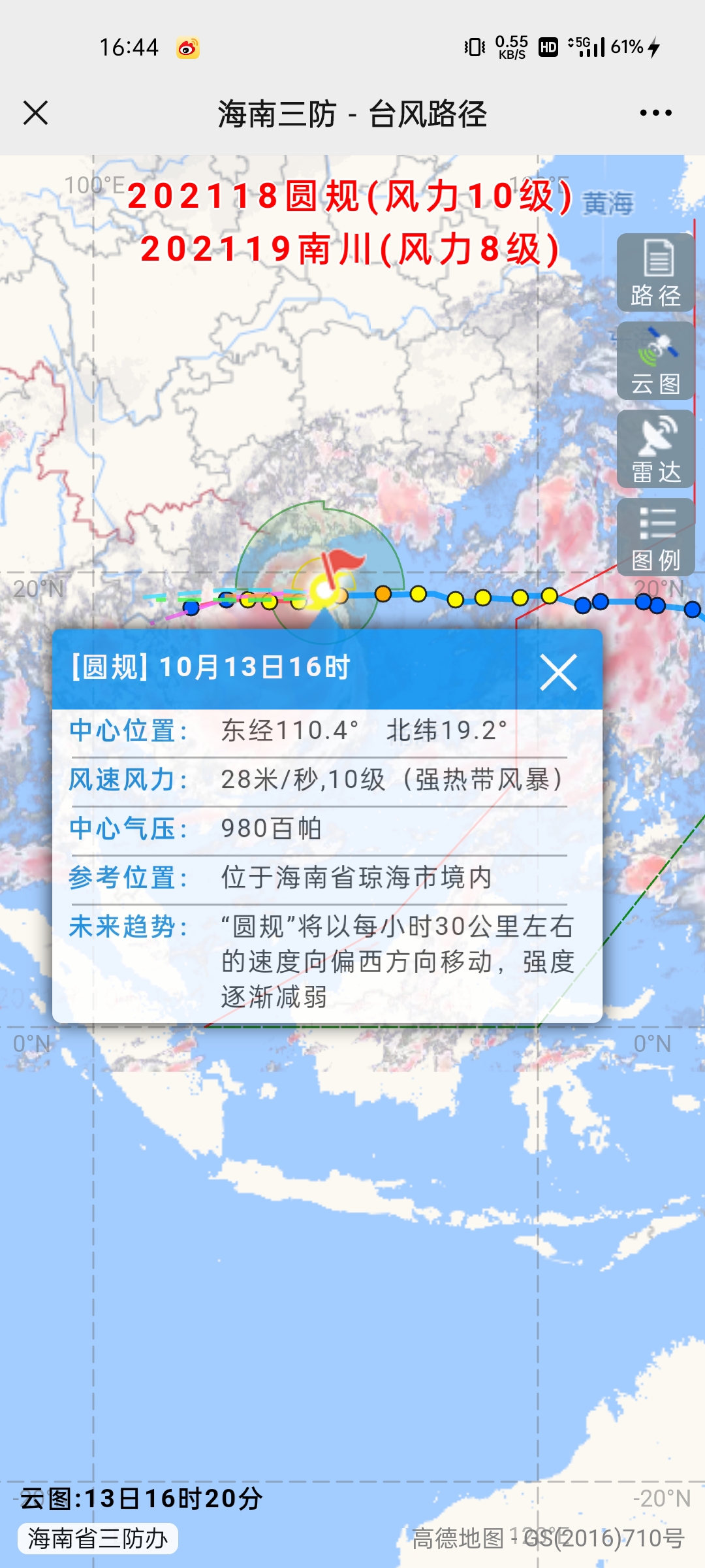 据监测,今年第18号台风“圆规”已于13日16时减弱为强热带风暴,13日16时中心位于北纬19.2度,东经110.4度,也就是位于海南省琼海市境内,中心附近最大风力10级(28米/秒),七级风圈半径260—420公里,十级风圈半径100—150公里。