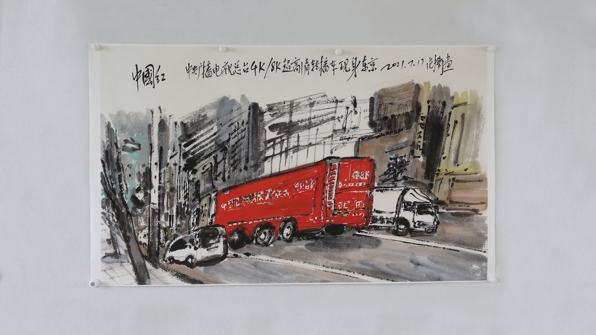 “如果信念有颜色,那一定是中国红。”范扬认为在艺术家笔下,色彩是有感情的,中国红不仅是一种颜色,更是表达民众上下同心、凝聚爱国力量的精神象征。今年7月30日,参加东京奥运会转播的中央广播电视总台8K超高清转播车首次亮相东京街头迅速引发媒体关注,他第一时间创作完成了画作《中国红》,并赠送总台。