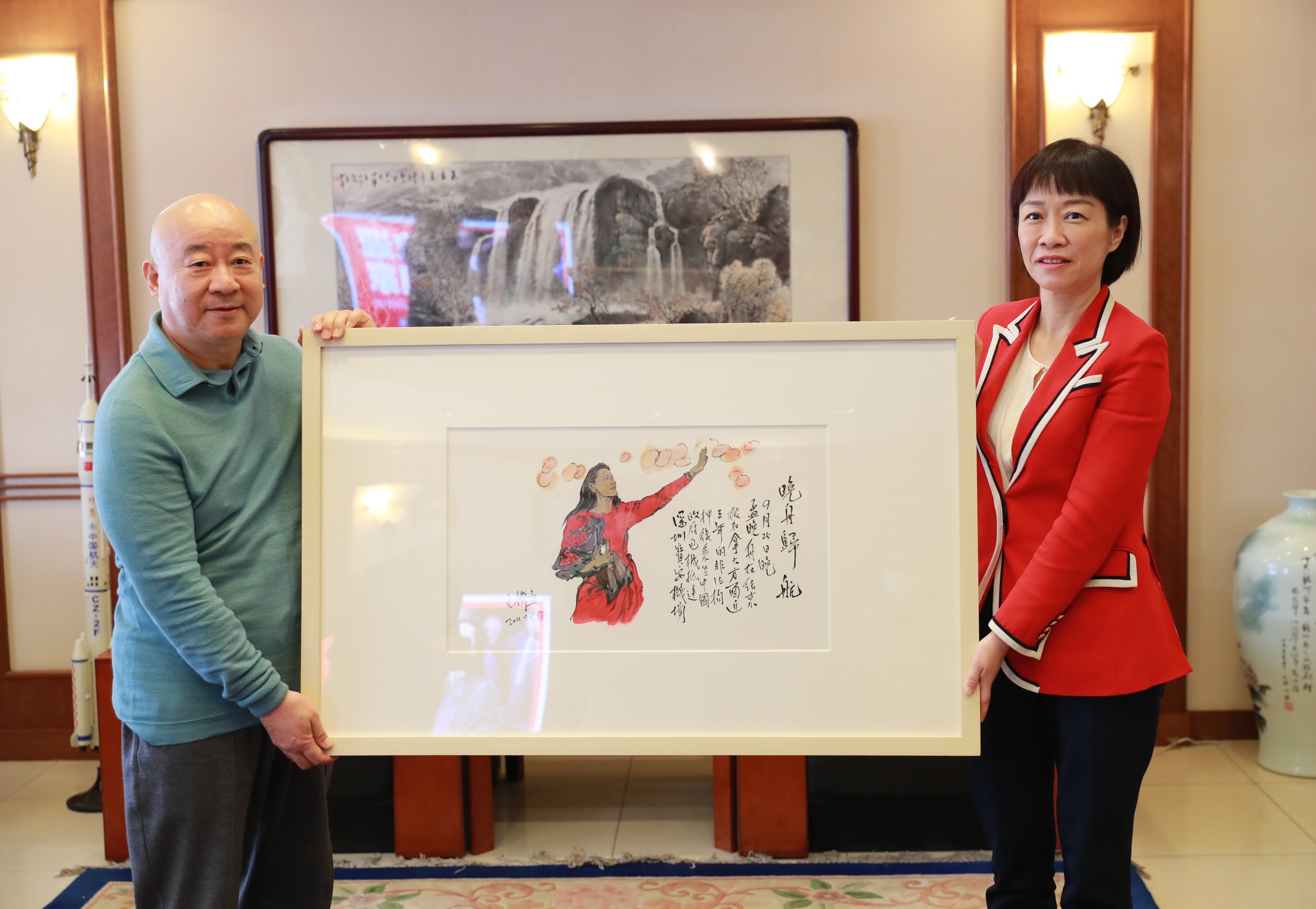 接受《晚舟归航》画作的华为公司高级副总裁陈黎芳表示,感谢党和政府对维护中国公民、中国企业正当合法权益的不懈努力,感谢社会各界对华为公司的支持与鼓励,感谢中央广播电视总台对孟晚舟归国事件的持续关注报道。作为一家民营企业,华为公司所面临的技术封锁和打压依然存在,但一定不负厚望,努力创新研发,继续为国争光。