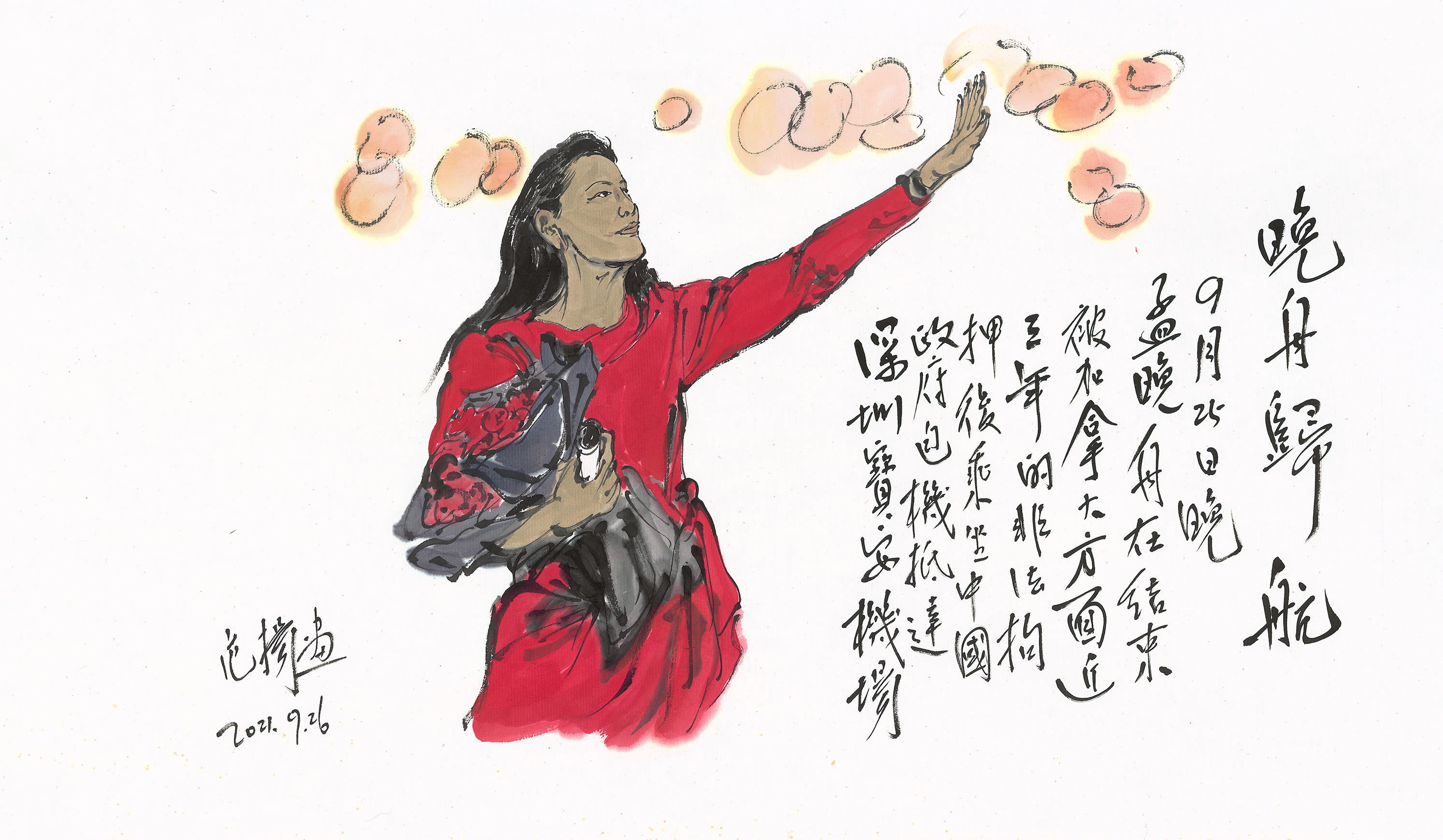 9月25日晚,华为公司首席财务官孟晚舟乘坐中国政府包机返回祖国。一直关注这一重大新闻事件的著名画家范扬,全程收看了中央广播电视总台的现场直播。直播中,重回祖国怀抱的孟晚舟表示,滞留异国他乡三年,无时无刻不感受到党、祖国还有人民的关爱和温暖,祖国是我们最坚强的后盾。这一激动人心的场景,深深触动了画家范扬并激发出新的创作灵感。他当场挥毫泼墨,将这一抹中国红定格在画作中,并起名为《晚舟归航》。