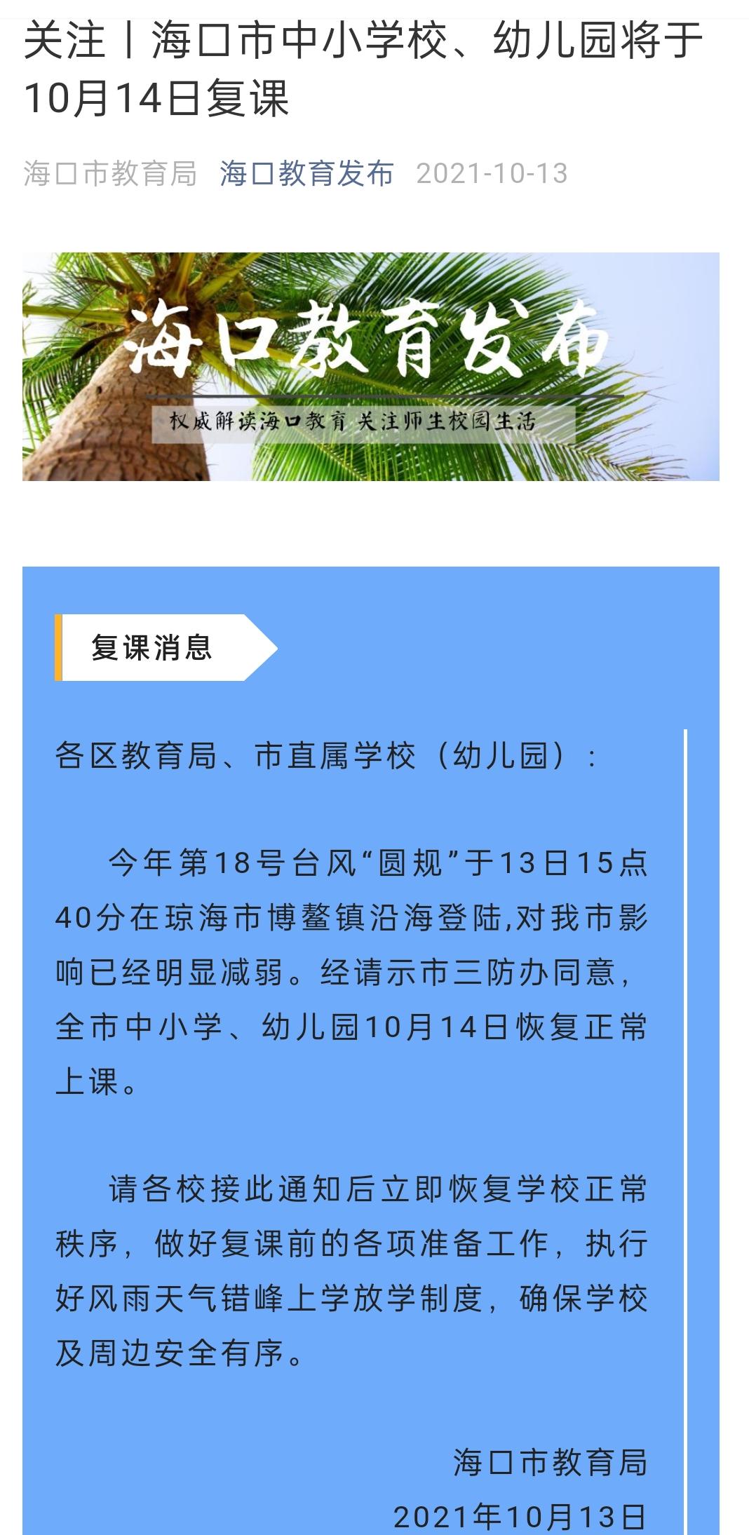 记者13日晚从海口市教育局获悉,今年第18号台风“圆规”于13日15点40分在琼海市博鳌镇沿海登陆,对海口市影响已经明显减弱。经海口市三防办同意,海口市教育局13日晚发布复课通知,海口全市中小学、幼儿园10月14日恢复正常上课。各校接通知后需立即恢复学校正常秩序,做好复课前的各项准备工作,执行好风雨天气错峰上学放学制度,确保学校及周边安全有序。