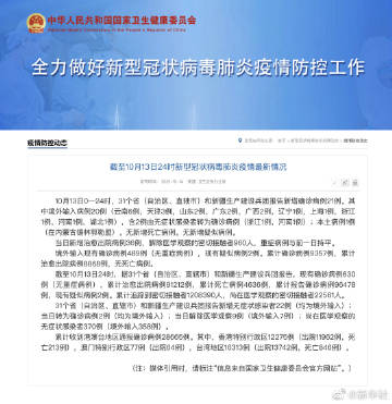 【#10月13日新增确诊病例21例# #10月13日新增本土病例1例#】据国家卫生健康委员会官方网站,10月13日0—24时,31个省(自治区、直辖市)和新疆生产建设兵团报告新增确诊病例21例。其中境外输入病例20例(云南6例,天津3例,山东2例,广东2例,广西2例,辽宁1例,上海1例,浙江1例,河南1例,湖北1例),含2例由无症状感染者转为确诊病例(浙江1例,河南1例);本土病例1例(在内蒙古锡林郭勒盟)。无新增死亡病例。无新增疑似病例。