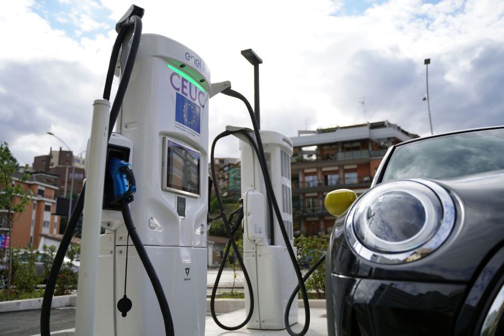 10月9日,车辆在位于罗马的意大利国家电力公司设立的Enel X快充站充电。(新华社记者金马梦妮摄)