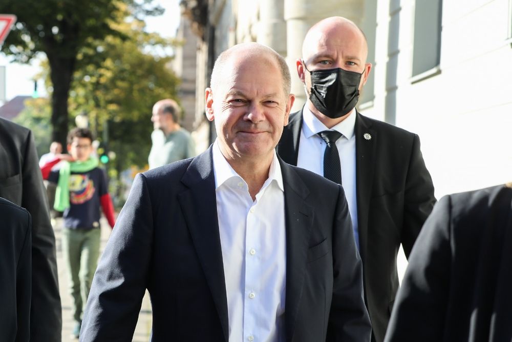 9月26日,在德国波茨坦,德国社会民主党总理候选人朔尔茨(前)抵达投票站。(新华社记者单宇琦摄)