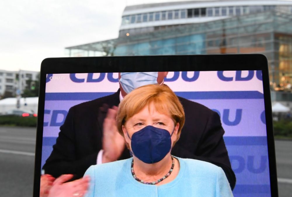 9月26日在德国柏林德国基督教民主联盟(基民盟)总部前拍摄的德国总理默克尔出席集会的视频直播画面。(新华社记者逯阳摄)