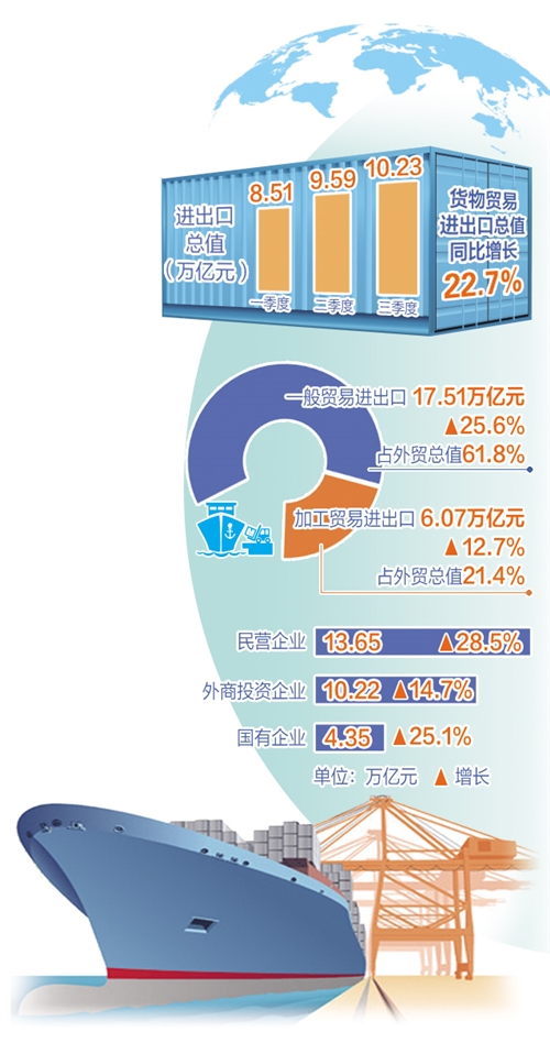 10月13日,海关总署发布的数据显示,前三季度,我国货物贸易进出口总值达28.33万亿元,较去年同期增长22.7%。其中,出口15.55万亿元,增长22.7%;进口12.78万亿元,增长22.6%。与2019年同期相比,外贸进出口、出口、进口分别增长23.4%、24.5%和22%。