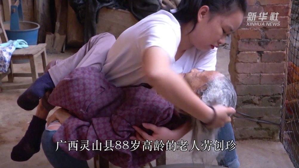 【#90后孙媳妇抱88岁奶奶洗头发#】广西灵山县的劳凯英是一名90后,近几年她一直在家悉心照顾88岁高龄生活不能自理的奶奶。今年8月,劳凯英开始把照顾奶奶的视频分享到网络,她说奶奶越来越老,拍视频是为了记录。而她抱着奶奶洗头发的视频触动许多网友泪点,引来大量网友点赞和评论。网友:#小时候她们也这样抱着我们洗头发#。(记者黄耀滕) 新华社的微博视频