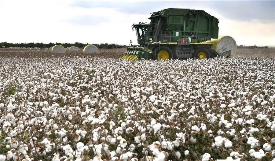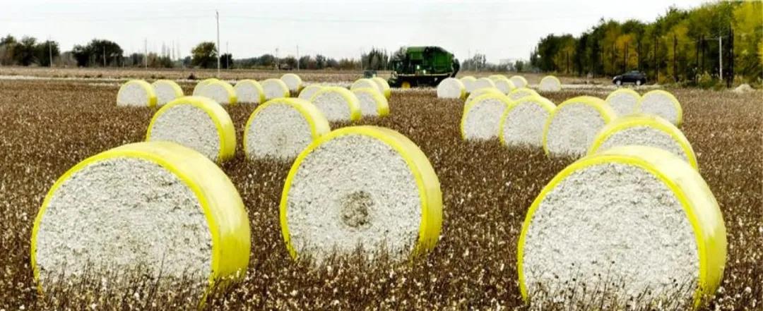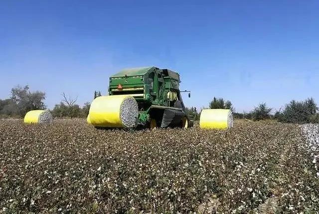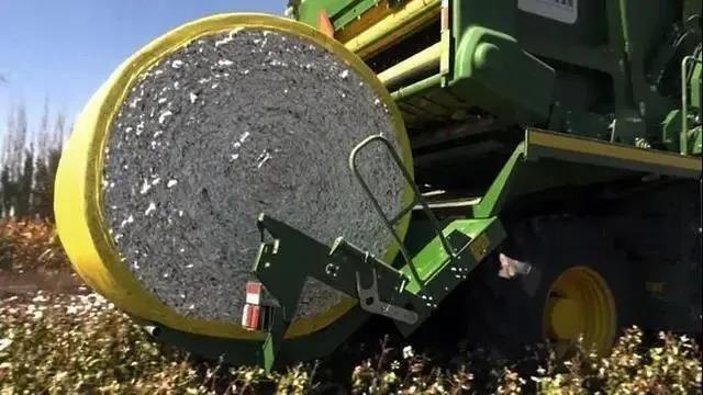 在新疆昌吉,如今棉花采收已经广泛采用了打包采棉机,机器一边采收,一边将已采棉花打包、压缩成卷。整个过程棉花不落地,沾染杂质的可能性降低了不少。