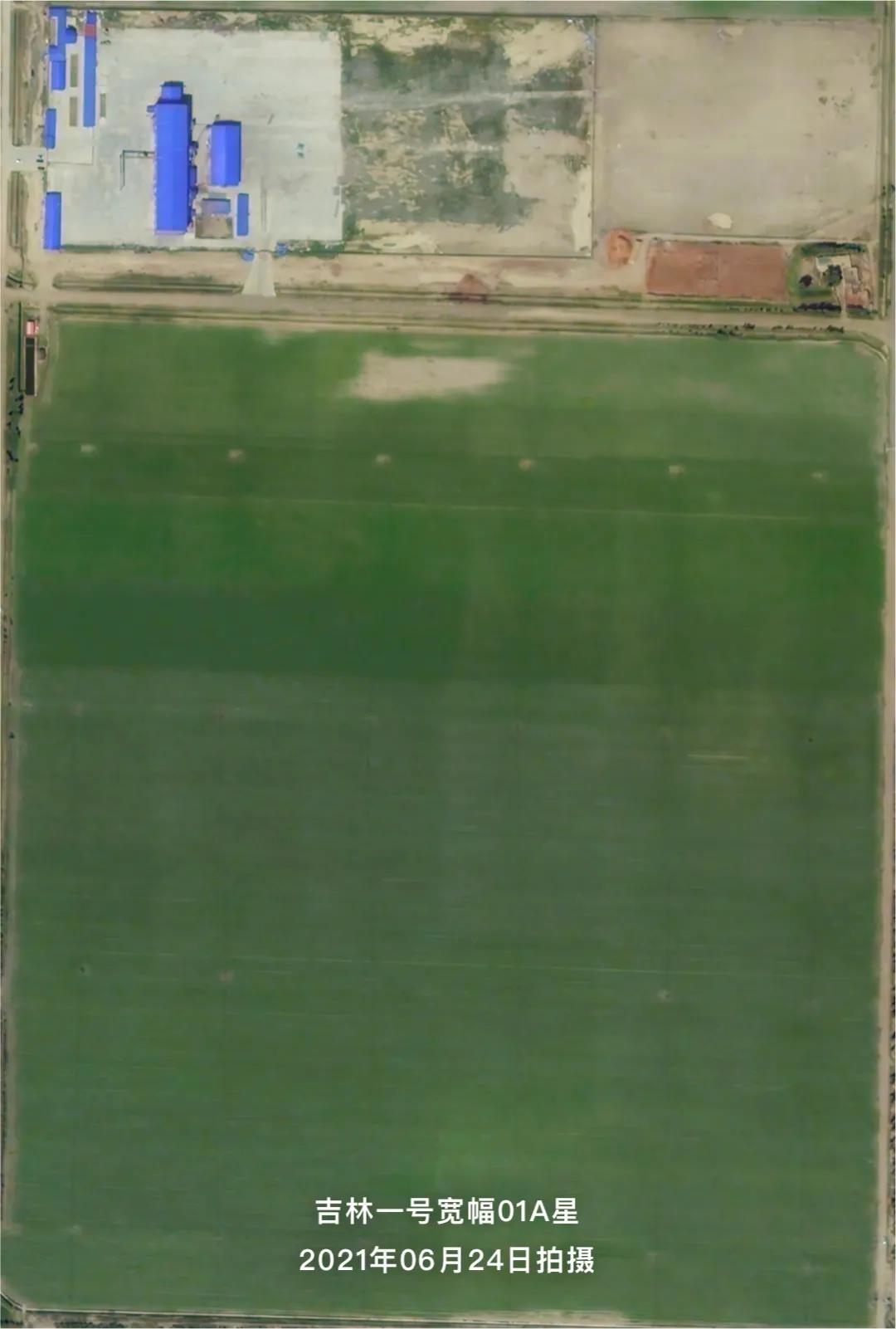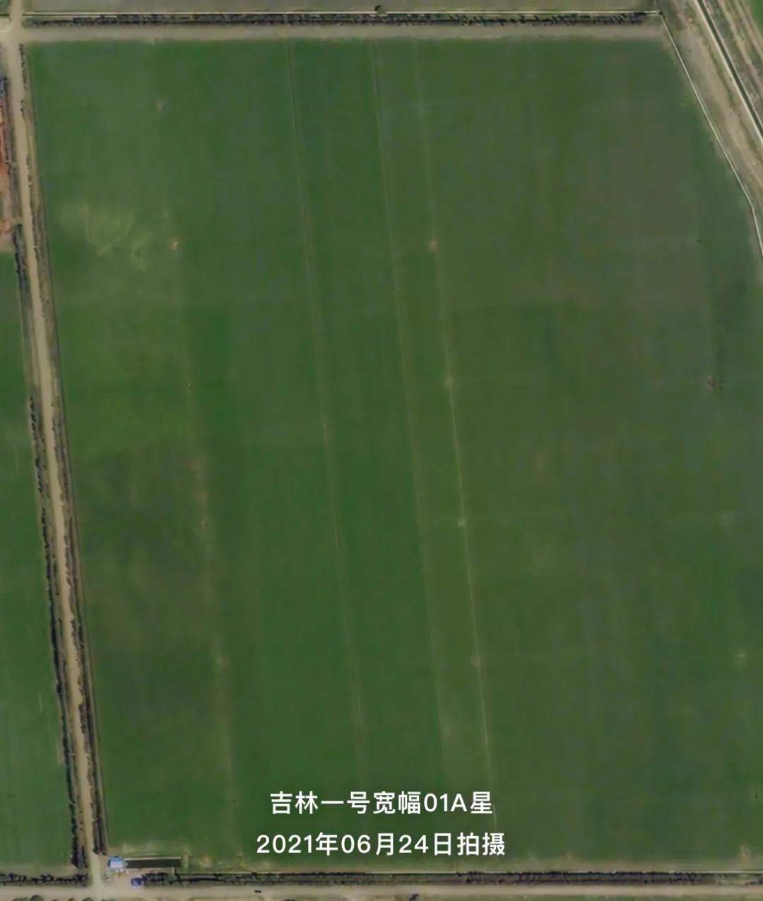 卫星在夏管时期(2021年6月24日)再次拍摄了这一片棉田。此时的棉田一片翠绿,棉花长势喜人,生机勃勃。