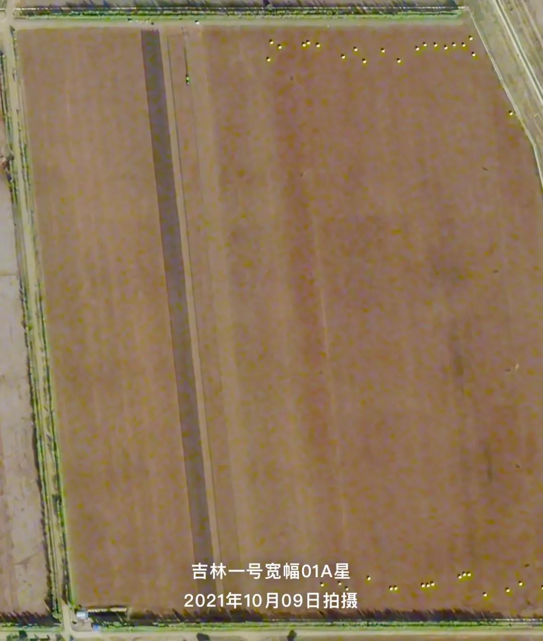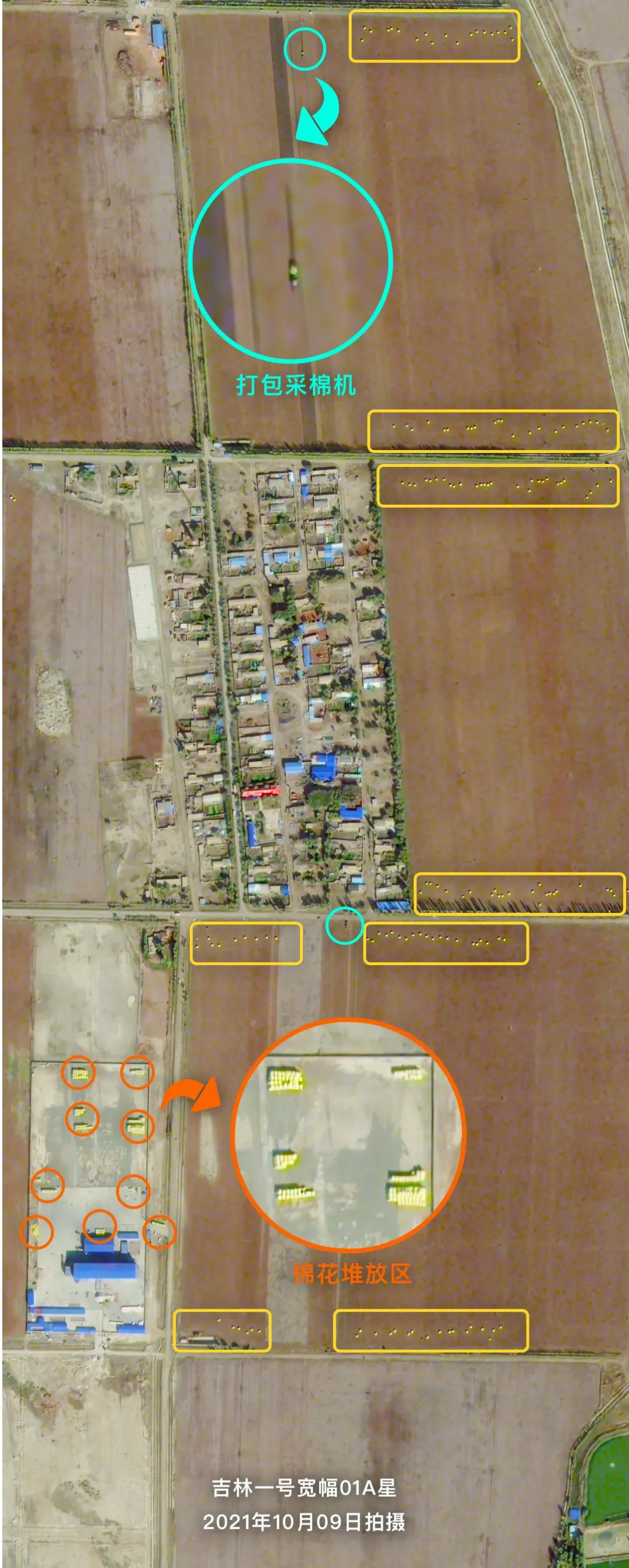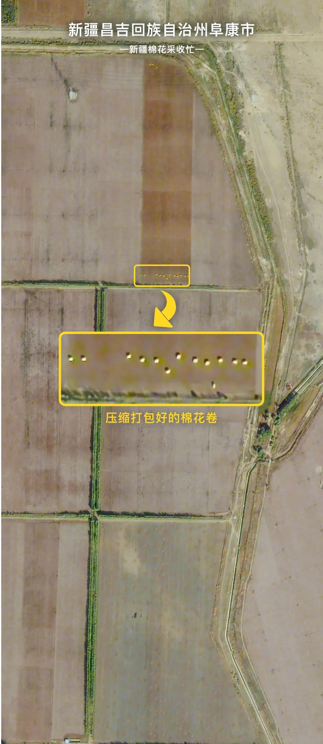 卫星拍摄的秋收时刻(2021年10月09日)的该片棉田,一辆采棉机正在棉田之间穿梭完成采收工作。已经采收好的棉花被打包压缩成卷放置在棉田两侧。