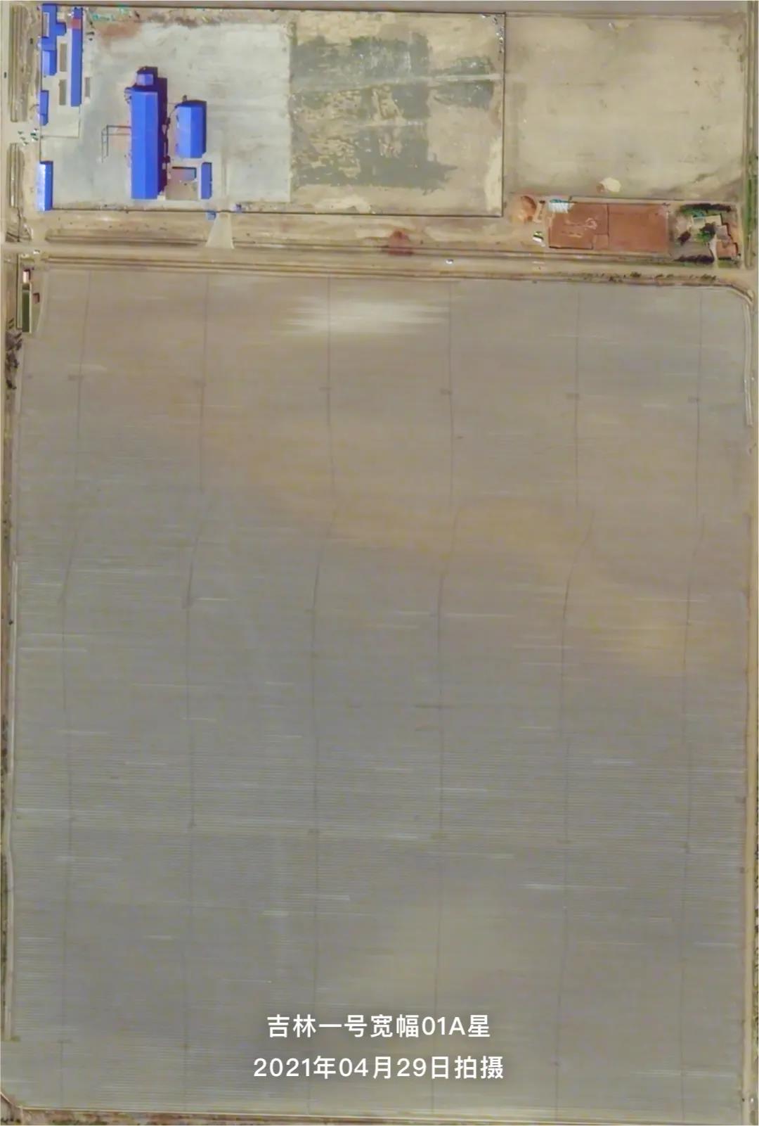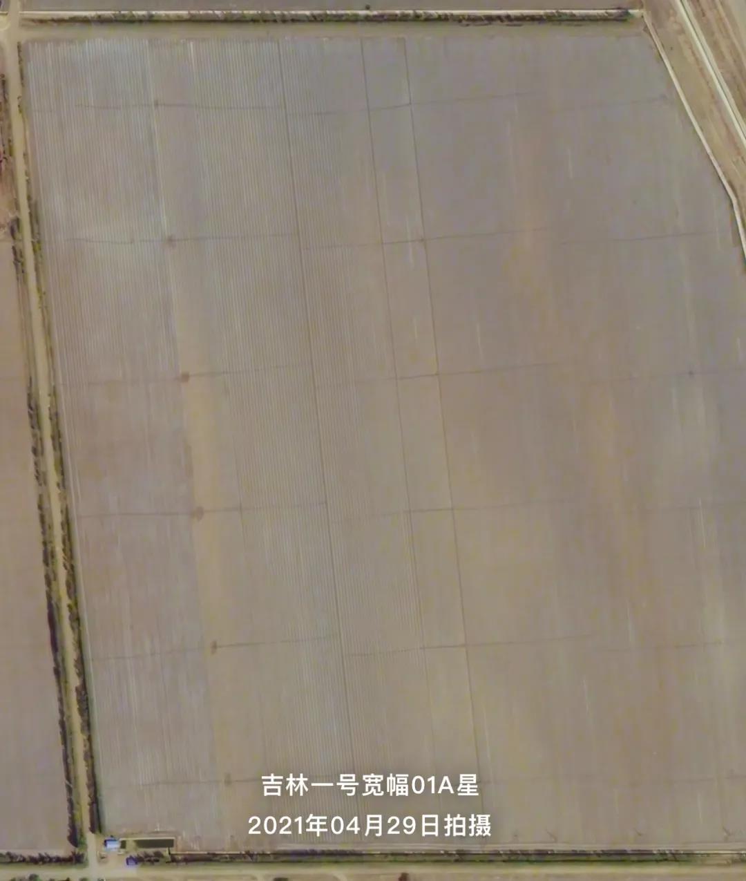 下图为吉林一号卫星于春种时期(2021年4月29日)拍摄的位于新疆昌吉回族自治州阜康市的另一片棉田。地膜铺设同样整齐划一。