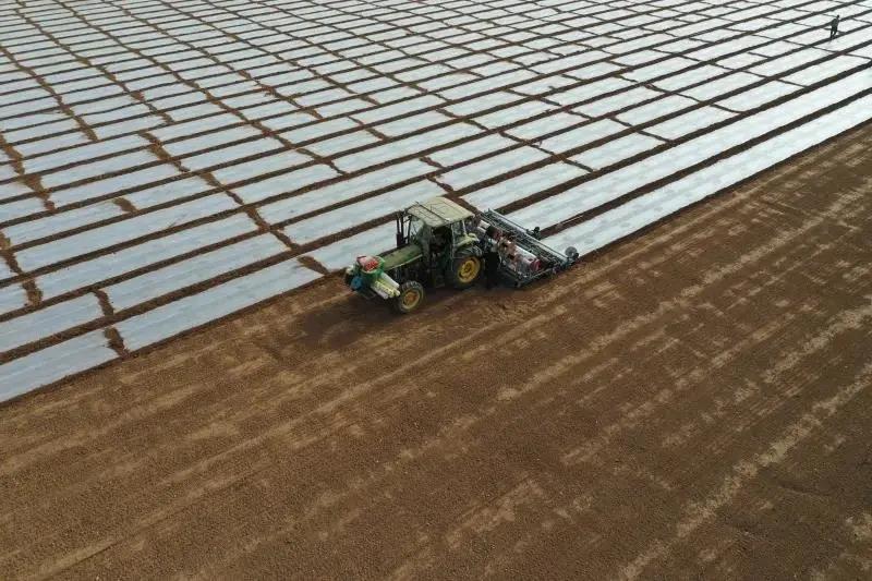 春种时期:天山以南的棉田每年4月上旬进入播种高峰期,天山以北的棉田在清明节后也开始大面积播种。从春天播种开始,棉田就使用了无人驾驶精量播种技术,由北斗导航系统精准定位,整地、铺设地膜、铺设滴灌带、精量播种一气呵成,提高了播种效率。也保证了收获时可以使用采棉机进行采收。