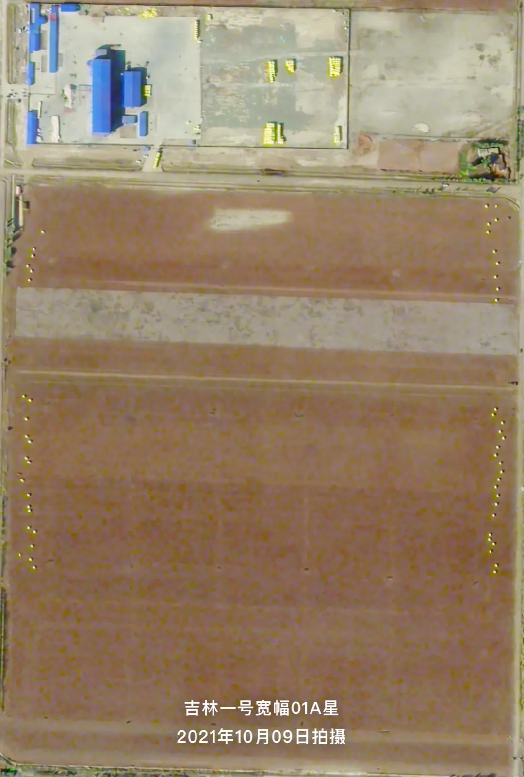 当卫星近日(2021年10月09日)再次“路过”这一片棉田时。已经到了秋收时节,此块棉田已经完成大部分的棉花采收工作,经过采棉机采收的棉田两侧堆积了一排已经打包好的棉花卷。紧挨着棉田的一处蓝色建筑周围,一团团棉花卷被整齐地排列堆积在一起,间隔分布在空地上。