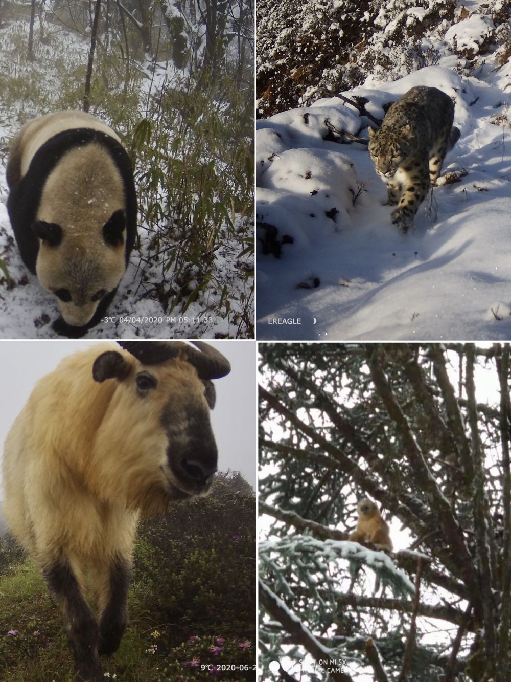 左上为大熊猫,右上为雪豹,左下为羚牛,右下为金丝猴