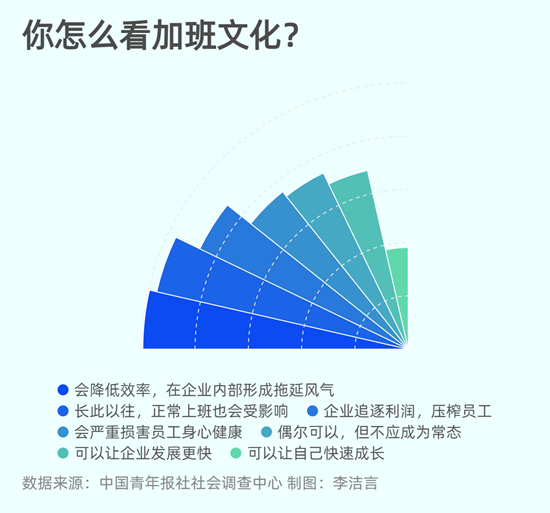 调查中,对于加班文化,49.8%受访者认为会降低效率,在企业内部形成拖延风气,48.4%的受访者感觉长此以往,正常上班也会受影响,43.4%的受访者认为这是企业追逐利润、压榨员工的结果。