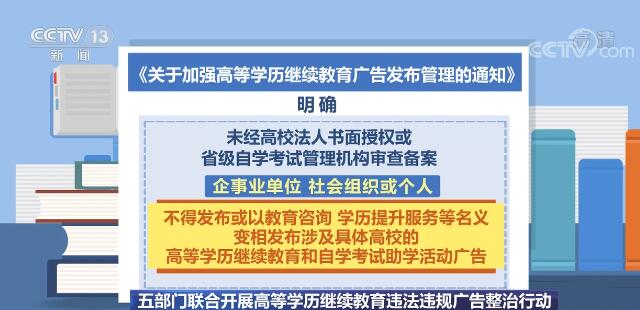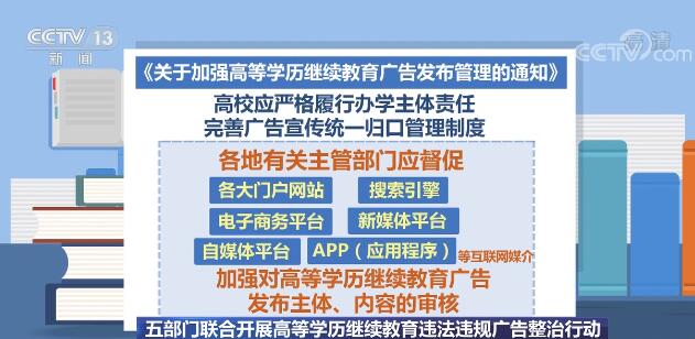 目前,各地开展为期三个月的专项整治行动,对违法违规案件进行查处。下一步,教育部等五部门将推动治理常态化,有效规范高等学历继续教育广告发布秩序。