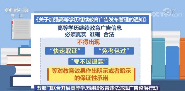 央视网消息:近日,教育部、市场监管总局、中央网信办、工业和信息化部、公安部等五部门联合印发《关于加强高等学历继续教育广告发布管理的通知》,提出高等学历继续教育广告信息不得出现“快速取证”“免考包过”“考不过退款”等对教育效果作出明示或者暗示的保证性承诺等要求。