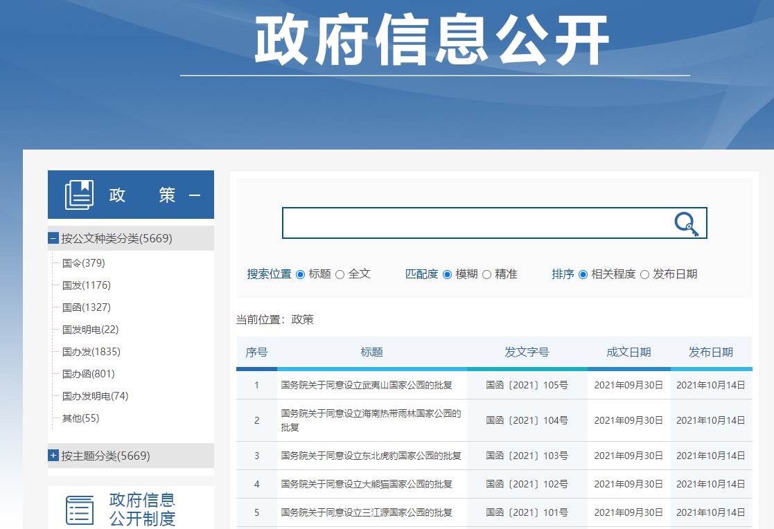 国务院批复同意设立三江源、大熊猫、东北虎豹、海南热带雨林、武夷山国家公园