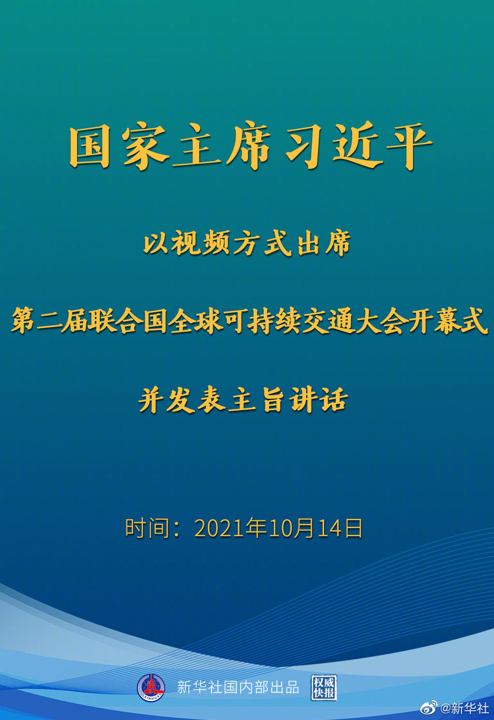 10月14日晚,国家主席习近平以视频方式出席第二届联合国全球可持续交通大会开幕式并发表主旨讲话。
