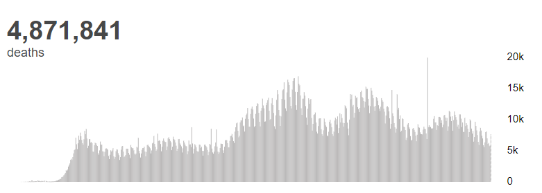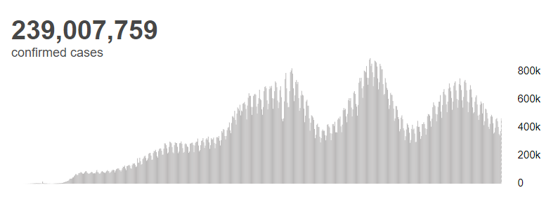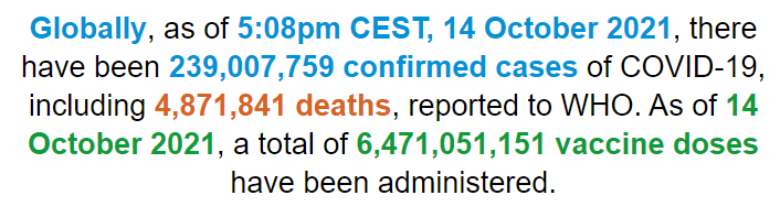 根据世卫组织最新实时统计数据,截至欧洲中部夏令时间10月14日17时08分(北京时间10月14日23时08分),全球新冠肺炎累计确诊239007759例,累计死亡4871841例。