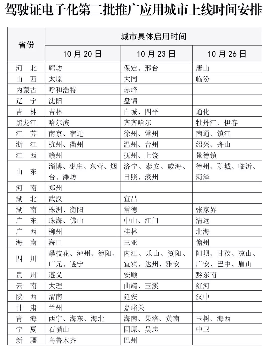 自今年10月20日起,在全国第一批推广应用基础上,驾驶证电子化公安交管便利措施将在太原、沈阳、哈尔滨等110个城市第二批推广应用,为驾驶人提供在线“亮证”“亮码”服务,进一步简化办事手续资料,提升证件使用便捷度,更好便利群众办事出行,更好服务企业行业发展。
