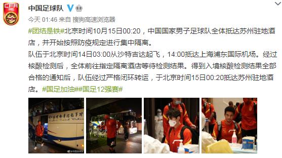 据“中国足球队”官方微博消息,北京时间10月15日凌晨00:20,中国国家男子足球队全体抵达苏州驻地酒店,并开始按照防疫规定进行集中隔离。