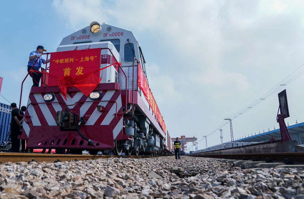 9月28日在启动仪式现场拍摄的“上海号”列车。首发“上海号”列车装运着50个满载服装鞋帽、玻璃器皿、汽车配件、精密仪器等货物的集装箱,从上海一路向西,经阿拉山口出境,预计两周后抵达德国汉堡。(新华社记者 丁汀摄)
