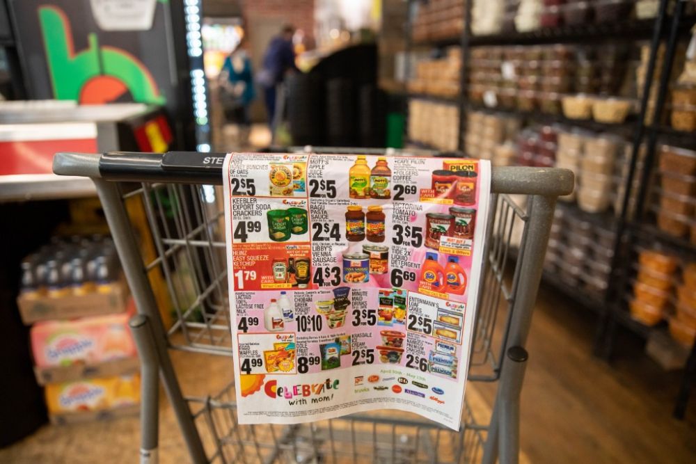 这是5月12日在美国纽约一家超市内拍摄的商品打折广告。(新华社发,郭克摄)