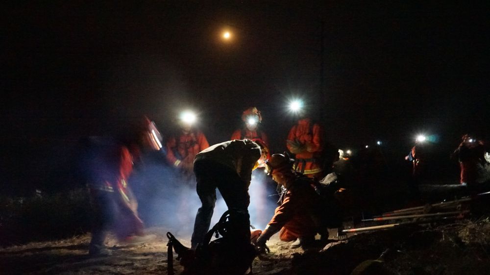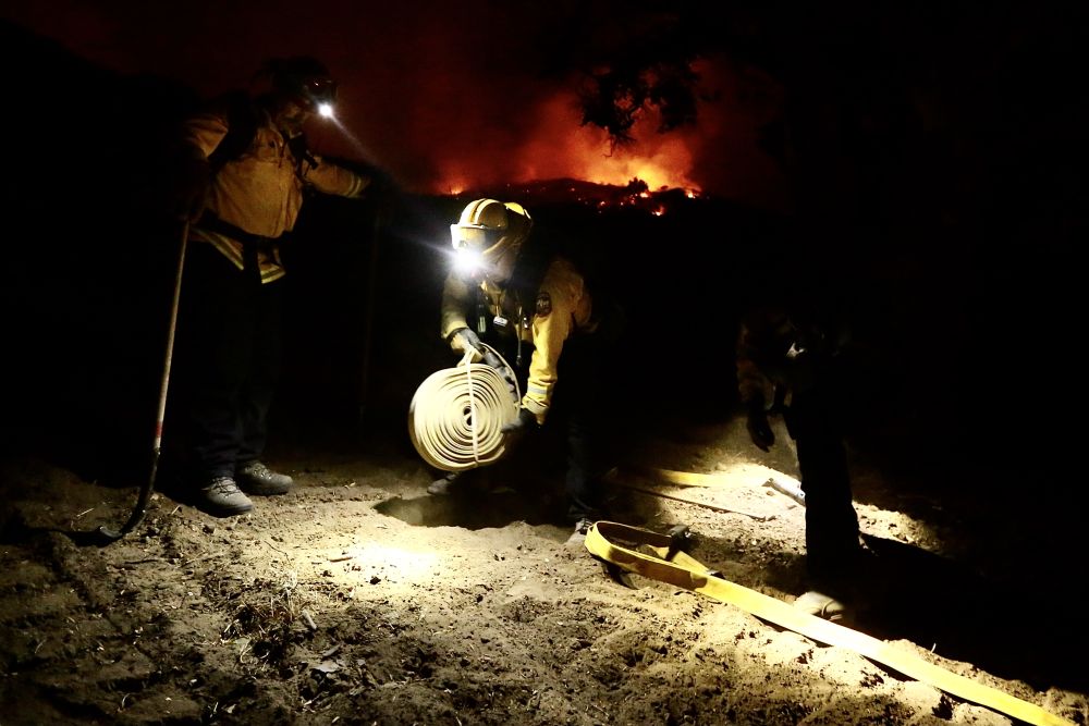 ↑10月14日,消防员在美国加利福尼亚州圣巴巴拉县山火区域工作。
