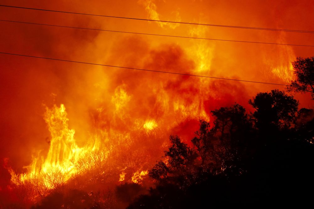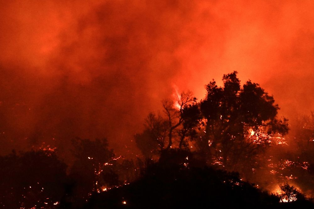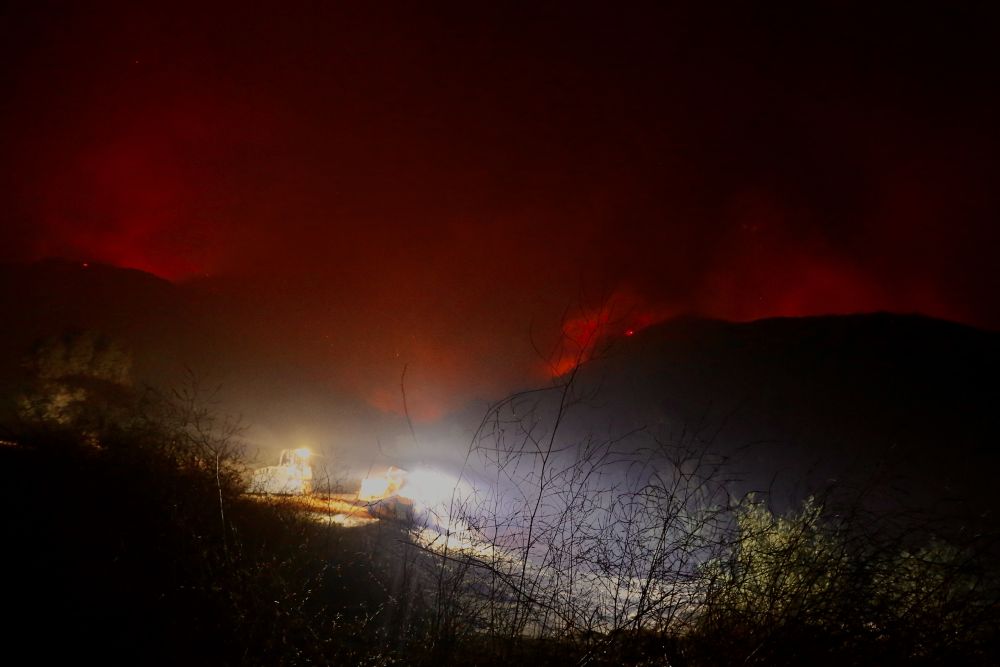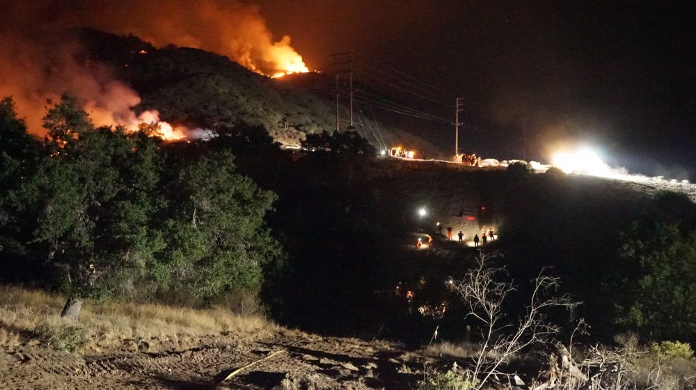 ↑这是10月13日深夜在美国加利福尼亚州圣巴巴拉县拍摄的山火。