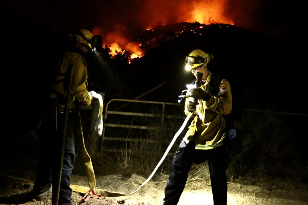 ↑10月13日,消防员在美国加利福尼亚州圣巴巴拉县山火区域工作。