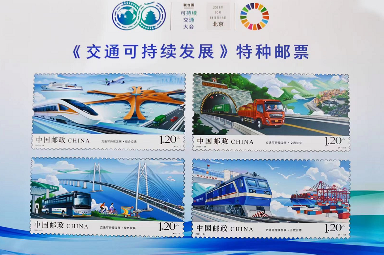 中国邮政发行的《交通可持续发展》特种邮票由宋鉴设计,采用手绘方式予以表现。第一枚综合交通,通过纵横交错的高铁、公路、机场、邮轮等多种现代化交通工具及设施,体现了高效便捷的现代化、立体化交通网络。第二枚交通扶贫,通过高黎贡山独龙江公路隧道、独龙江乡以及往来运输的车辆等,体现了通过交通建设帮助贫困地区脱贫,促进经济发展的概念。第三枚绿色发展,通过电动公交车和充电站、共享单车、快递车辆、港珠澳大桥、中华白海豚等元素,体现了资源集约利用、绿色发展、绿色出行的概念。第四枚开放合作,通过中欧班列穿越国门场景、货运港等元素,体现了交通开放合作,促进发展的精神。