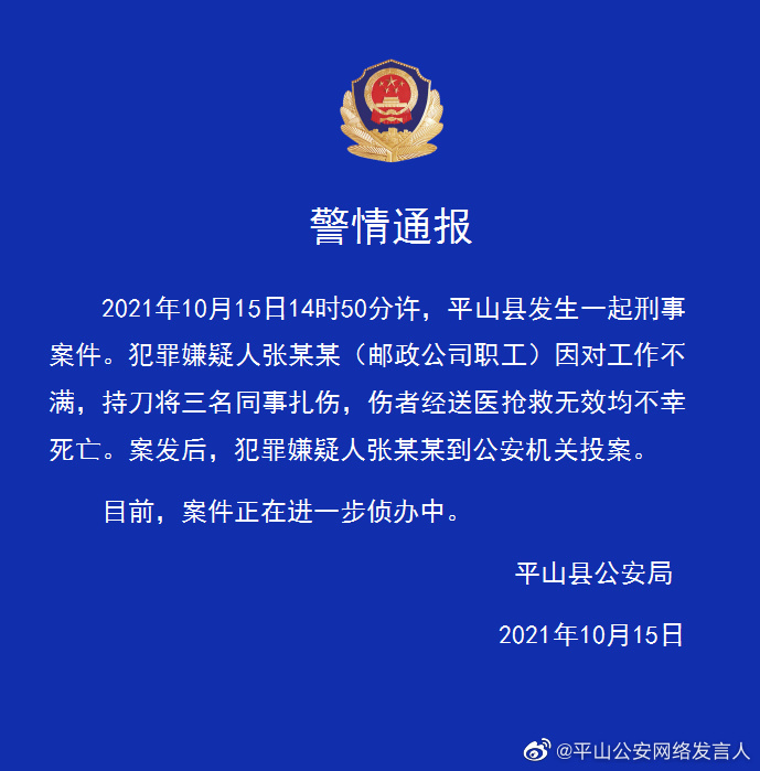 据河北平山县公安局通报,10月15日14时50分许,平山县发生一起刑事案件。犯罪嫌疑人张某某(邮政公司职工)因对工作不满,持刀将三名同事扎伤,伤者经送医抢救无效均不幸死亡。案发后,犯罪嫌疑人张某某到公安机关投案。目前,案件正在进一步侦办中。