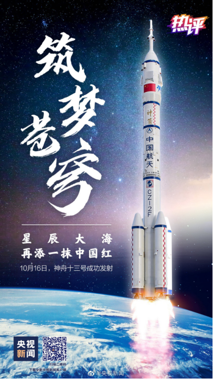 再探苍穹,神舟十三号出征太空。翱翔宇宙,与月同辉刷新中国高度。北京时间2021年10月16日0时23分,火箭拖曳着红色尾焰升空,像极了一抹绚丽的中国红。