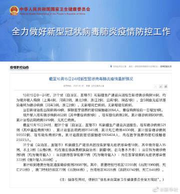 截至10月15日24时,据31个省(自治区、直辖市)和新疆生产建设兵团报告,现有确诊病例521例(其中重症病例1例),累计治愈出院病例91345例,累计死亡病例4636例,累计报告确诊病例96502例,现有疑似病例2例。累计追踪到密切接触者1209424人,尚在医学观察的密切接触者20223人。