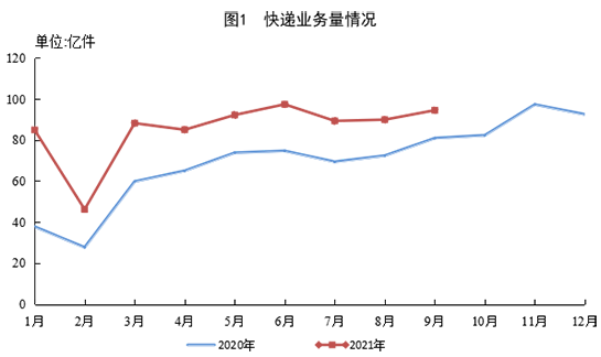 9月份,全国快递服务企业业务量完成94.5亿件,同比增长16.8%;业务收入完成921.4亿元,同比增长11.8%。