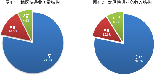 1-9月,东、中、西部地区快递业务量比重分别为78.3%、14.3%和7.4%,业务收入比重分别为78.3%、12.8%和8.9%。与去年同期相比,东部地区快递业务量比重下降1.3个百分点,快递业务收入比重下降1.5个百分点;中部地区快递业务量比重上升1.3个百分点,快递业务收入比重上升1.1个百分点;西部地区快递业务量比重基本持平,快递业务收入比重上升0.4个百分点。