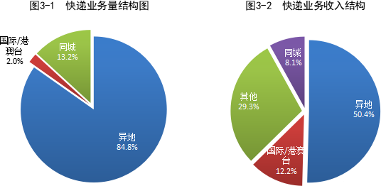 1-9月,同城、异地、国际/港澳台快递业务量分别占全部快递业务量的13.2%、84.8%和2.0%;业务收入分别占全部快递业务收入的8.1%、50.4%和12.2%。与去年同期相比,同城快递业务量的比重下降2.6个百分点,异地快递业务量的比重上升2.8个百分点,国际/港澳台业务量的比重下降0.2个百分点。