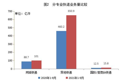 1-9月,全国快递服务企业业务量累计完成767.7亿件,同比增长36.7%;业务收入累计完成7430.8亿元,同比增长21.8%。其中,同城业务量累计完成101亿件,同比增长13.8%;异地业务量累计完成650.9亿件,同比增长41.5%;国际/港澳台业务量累计完成15.8亿件,同比增长25.6%。