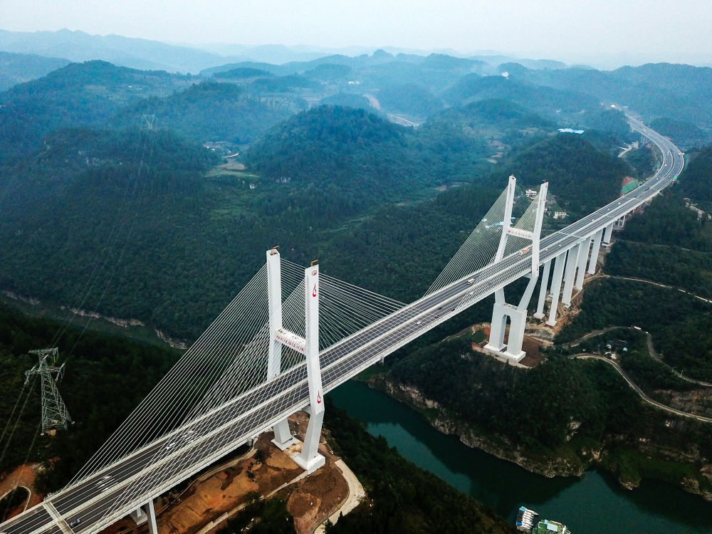 2018年10月6日拍摄的兰海高速贵阳至遵义复线扩容工程楠木渡乌江特大桥。(无人机照片,新华社记者杨文斌摄)