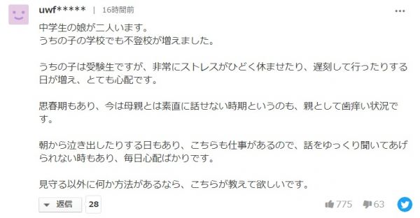 “我家有两个女儿,她们学校‘不登校’的孩子也越来越多。我家孩子是考生,压力山大,让她在家休息或是迟到的天数也在增加,真是很担心。又是青春期,不再是能和妈妈说心里话的年纪了,当妈的也是愁死了。有的时候早上起来就开始哭,但是我自己也有工作,也没时间耐心听孩子说话。除了一直盯着之外还有啥好办法吗,求教各位。”