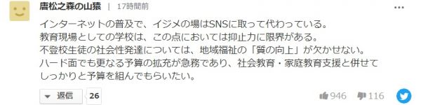“随着互联网的普及,欺凌的场所改在了社交媒体。学校作为教育一线在减少网络欺凌方面能力有限。对于‘不登校’学生的社会发展问题,必须通过提高地区福利水平解决。硬件方面的当务之急是扩充预算,与社会教育、家庭教育形成合力提供支持,希望能够好好规划一下预算怎么用吧。”