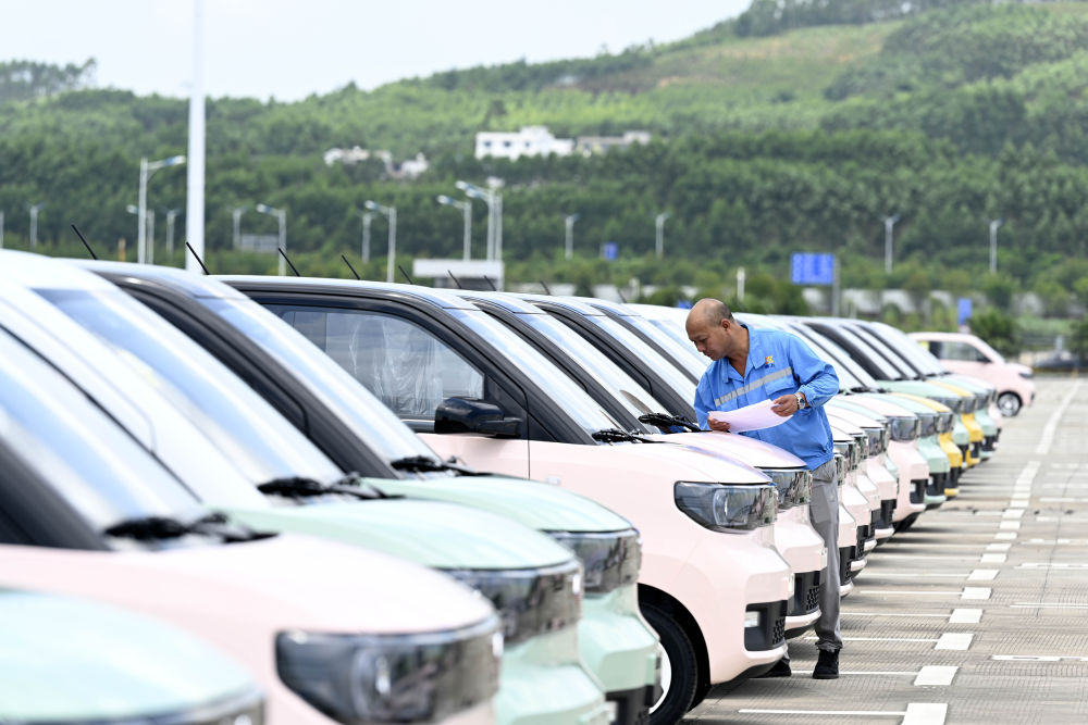 8月12日,在广西柳州一家汽车物流园,工作人员检查准备外运的新能源汽车。(新华社发,黎寒池摄)