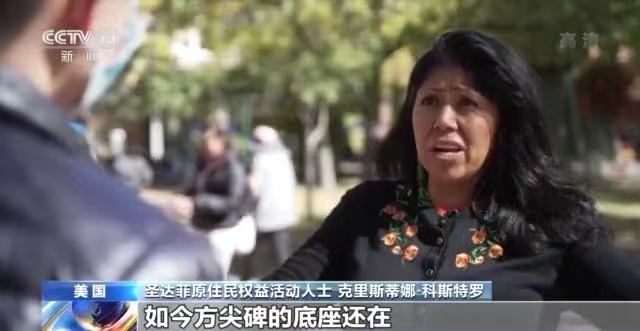 圣达菲原住民权益活动人士 克里斯蒂娜·科斯特罗:方尖碑上曾刻着为了纪念那些在新墨西哥州与野蛮原住民作战而牺牲的英雄。在美国历史上,我们原住民一直被冠以“野蛮”的形象,如今方尖碑的底座还在,市政府只是将它藏在箱子里。