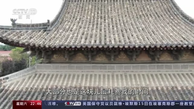 刘凯:这个古建筑是元代的,它是公元1320年,距今已经整整701年了。很多元代建筑其实都是单檐的,悬山的,像这种是歇山顶,而且是重檐的,比较珍贵。斗拱和瓦作这块,瓦就是一条一条的下来,还有斗拱层层叠叠上去,独具美感。我画画时,也是这块最耗费我的时间。来了之后就觉得很安静,就像现在我们这里,各种鸟叫的声音,很珍贵,在目前这样一个生活环境当中。